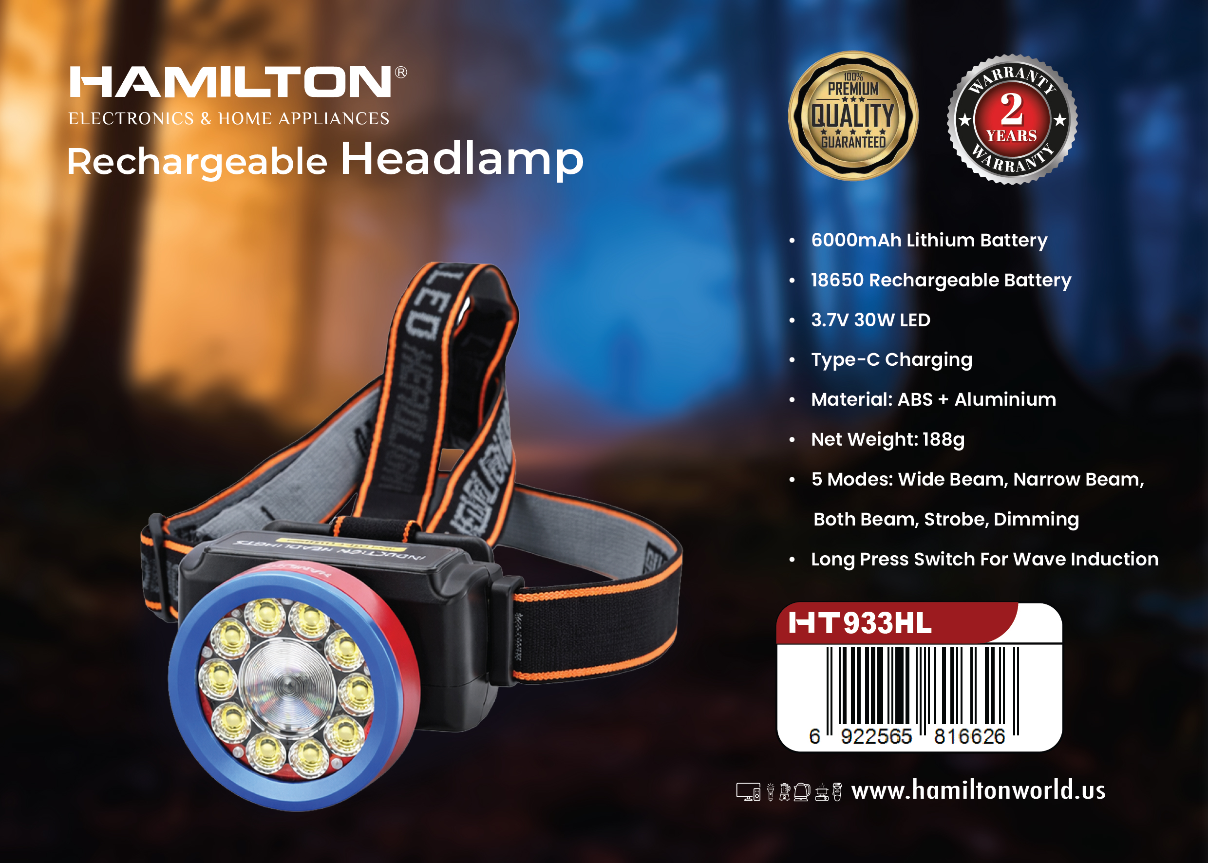 HAMILTON RECHARGEABLE HEAD LAMP 30W LED