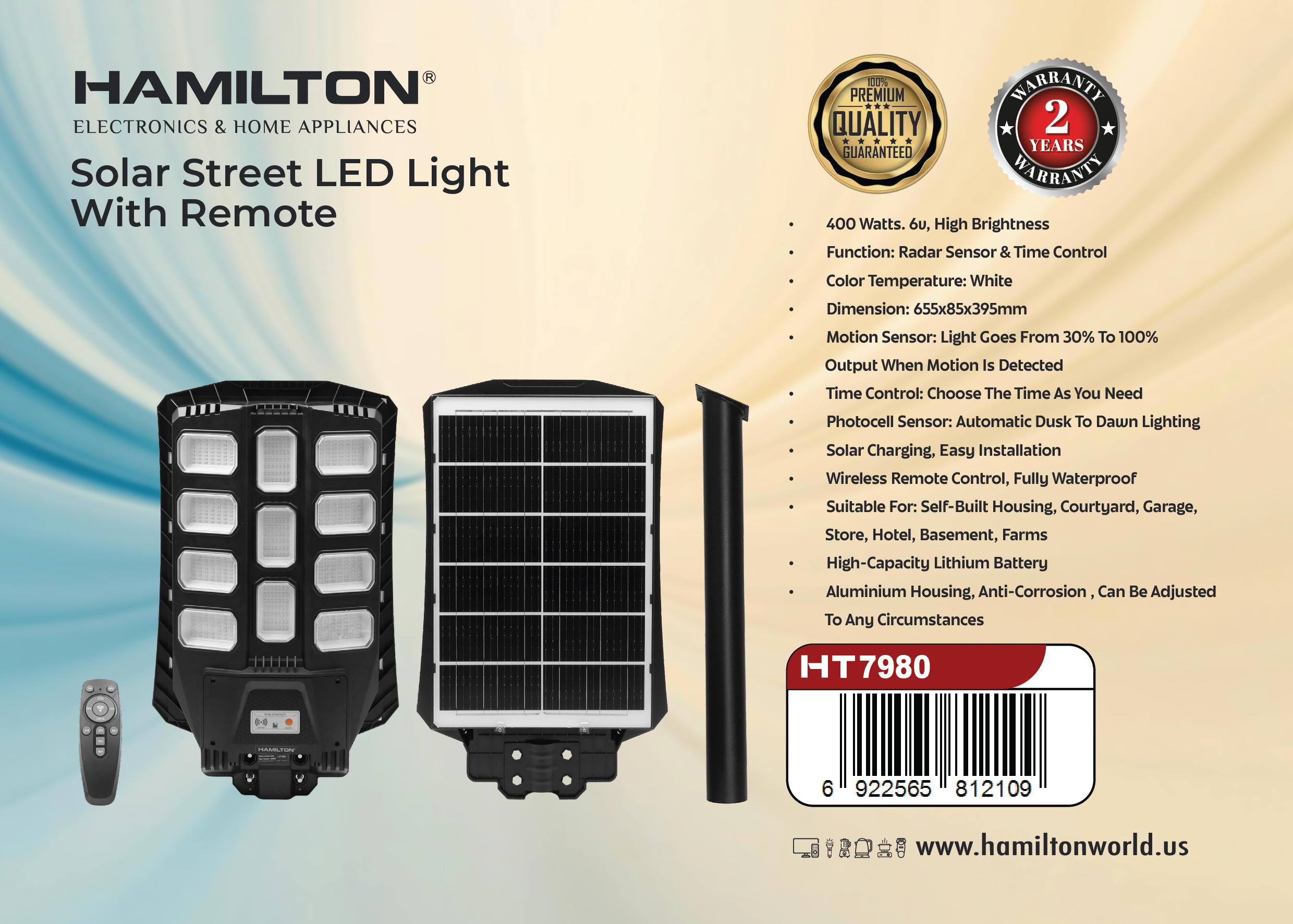 HAMILTON SOLAR STREET LED LIGHT WITH REMOTE 400W