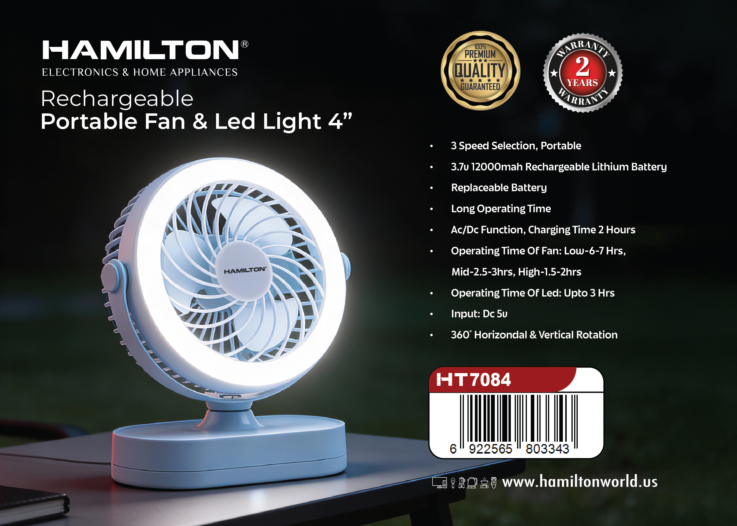 HAMILTON RECHARGEABLE PORTABLE FAN & LED LIGHT 4”